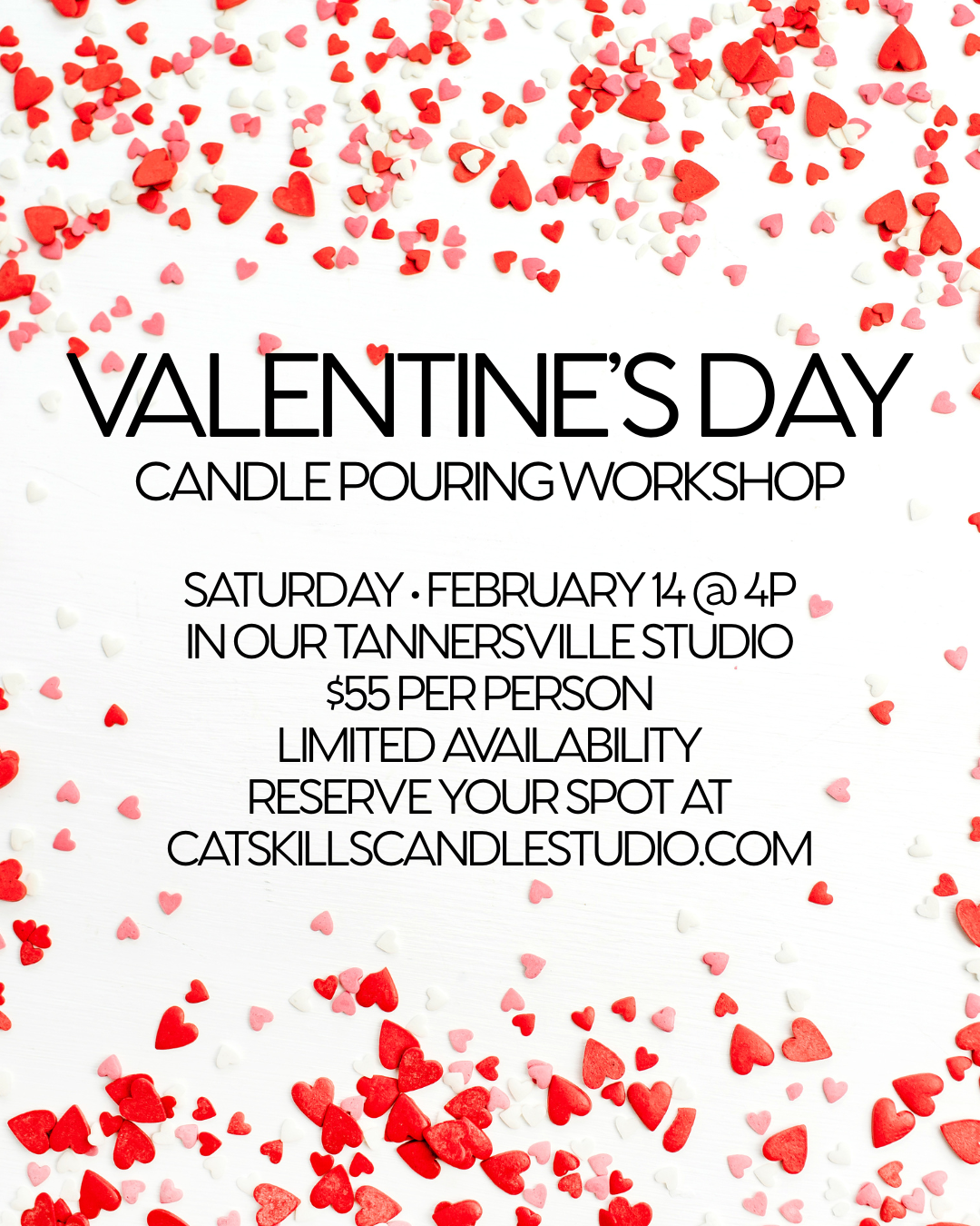 Join us in our Tannersville studio for a special Valentine’s Day Candle Pouring Workshop where you will create your own custom scent and pour a 9oz candle that is completely personal to you. It is warm, hands on and the perfect way to begin the evening before dinner or a night exploring The Catskills.