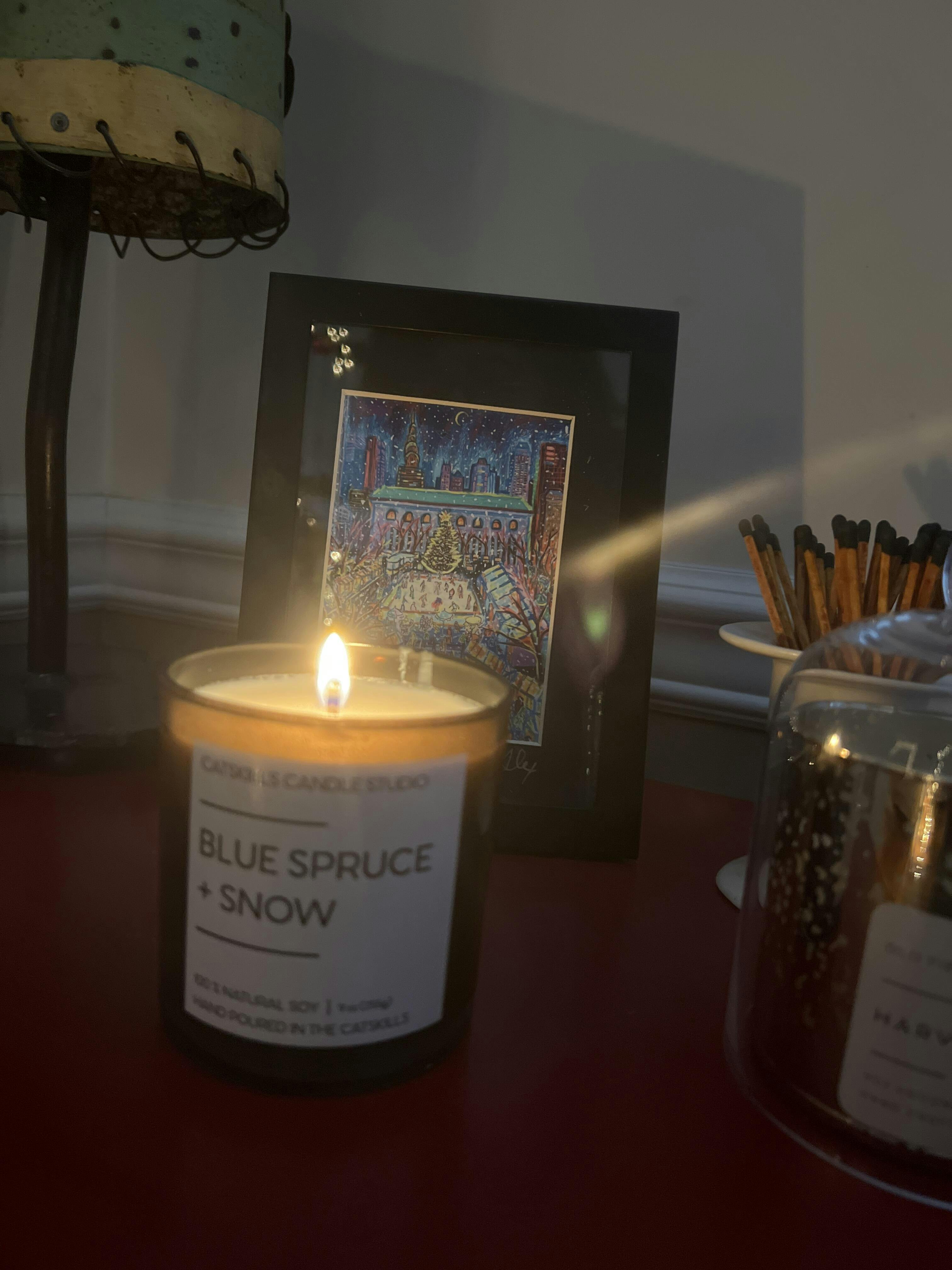 Imagine strolling through a snow-covered pine forest, where each step creates a soft, satisfying crunch beneath your feet, with a harmonious blend of the invigorating, outdoorsy scent of fragrant blue trees and the pure, pristine allure of freshly fallen snow.